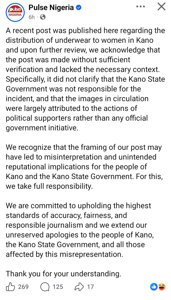 Pulse Nigeria has issued a public apology and clarification following widespread backlash over its earlier report suggesting that the Kano State Government distributed underwear to women as empowerment materials.