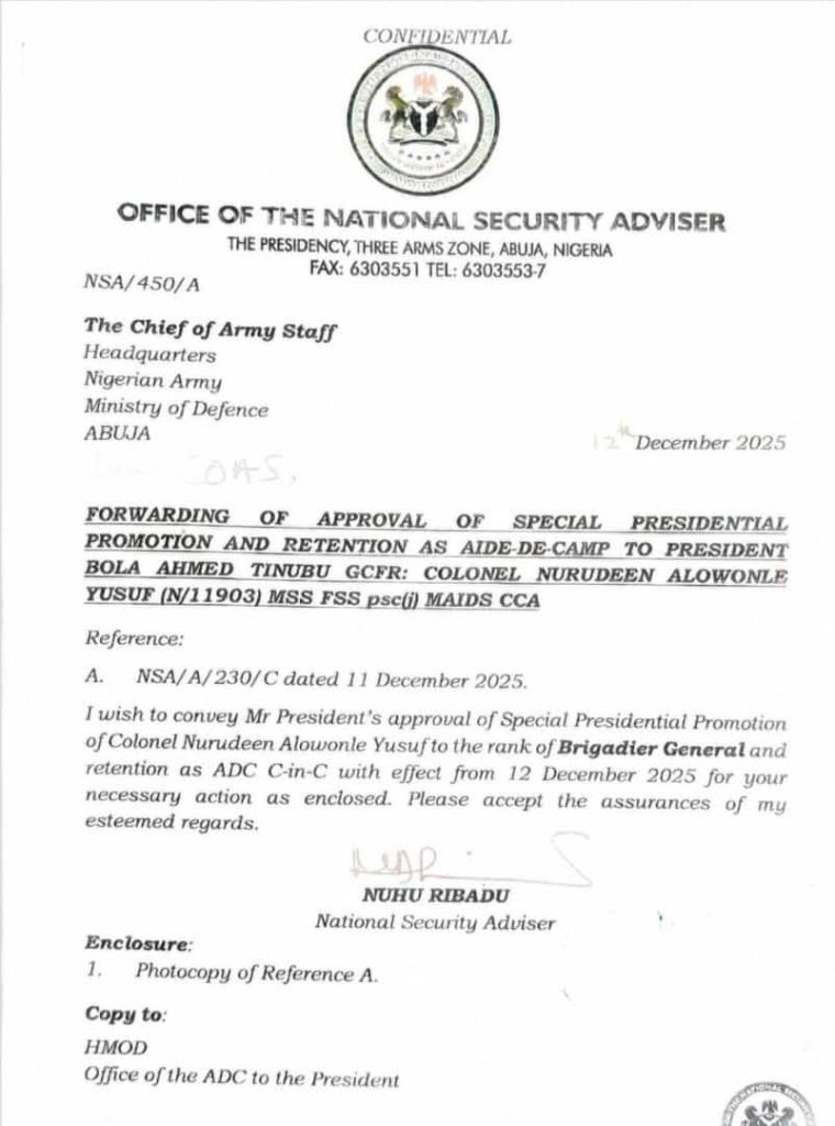 President Bola Tinubu has approved the promotion of his Aide-de-Camp (ADC), Nurudeen Yusuf, to the rank of brigadier-general, a development that has generated criticism and unease within sections of the Nigerian Army.